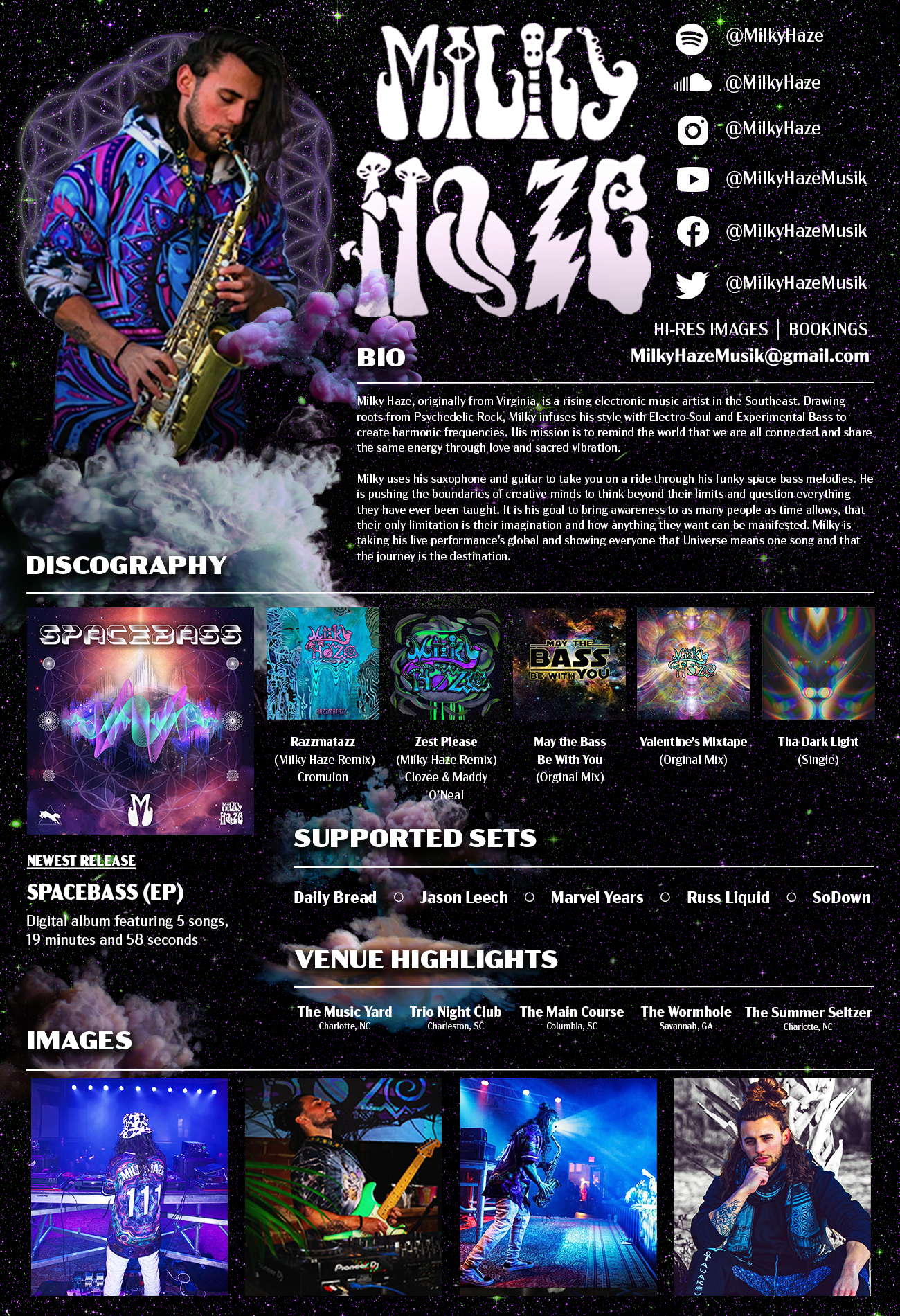 Milky Haze, originally from Virginia, is a rising electronic music artist in the Southeast. Drawing roots from Psychedelic Rock, Milky infuses his style with Electro-Soul and Experimental Bass to create harmonic frequencies. His mission is to remind the world that we are all connected and share the same energy through love and sacred vibration Milky uses his saxophone and guitar to take you on a ride through his funky space bass melodies. He is pushing the boundaries of creative minds to think beyond their limits and question everything they have ever been taught. It is his goal to bring awareness to as many people as time allows that their only limitation is their imagination and how anything they want can be manifested. Milky is taking his live performance"s global and showing everyone that Universe means one song and that the journey is the destination.